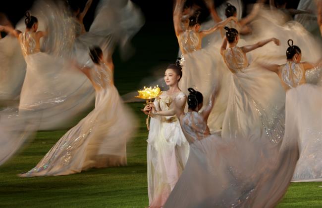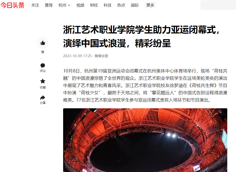 在火炬熄灭环节中,戏剧影视学院、音乐学院、演艺与教育学院学生在正对主席台主表演区核心区域进行歌舞表演,与数字火炬人“弄潮儿”一起带动现场观众对着火炬比心,见证亚运会火炬塔的熄灭。