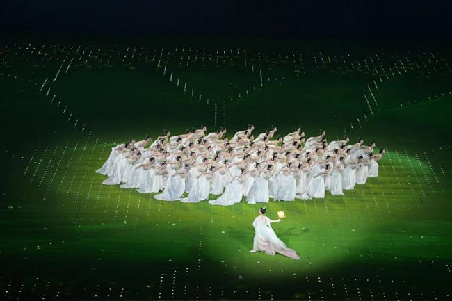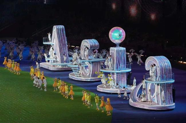 演艺与教育学院学生在节目《璀璨共此时》和运动员入场仪式中,在核心表演区域Asia四个字母车台组成的舞台上下进行歌舞表演,2019级表演艺术五年一贯班学生汪施琦担任领唱。