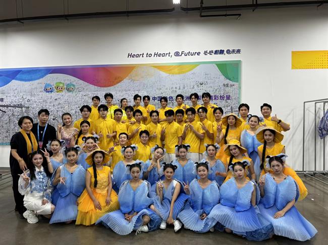 贵宾入场环节中,戏剧影视学院、音乐学院、演艺与教育学院34名学生在面对主席台主舞台前区中心位置表演,学生们的表演热情洋溢、活力十足。