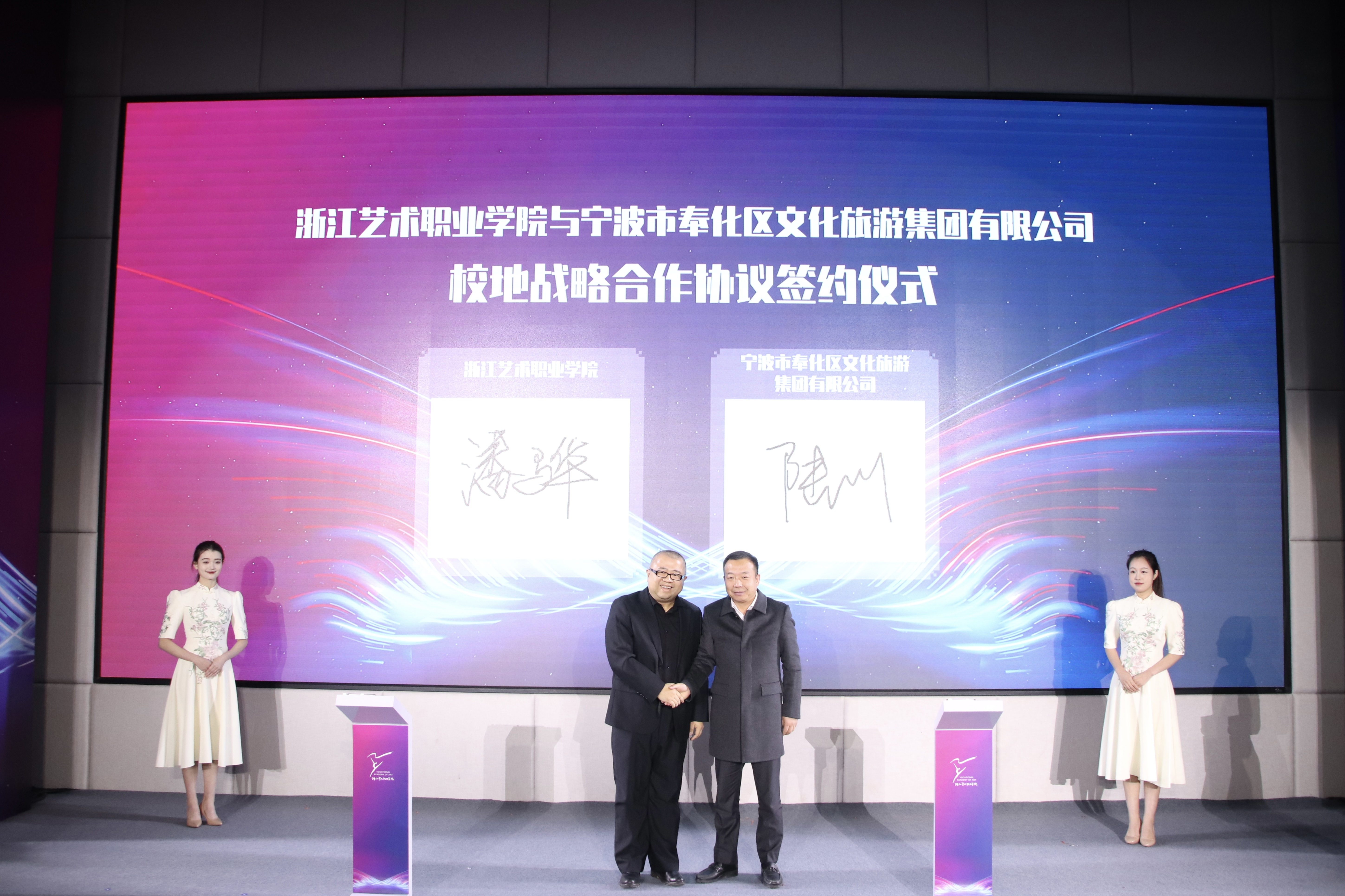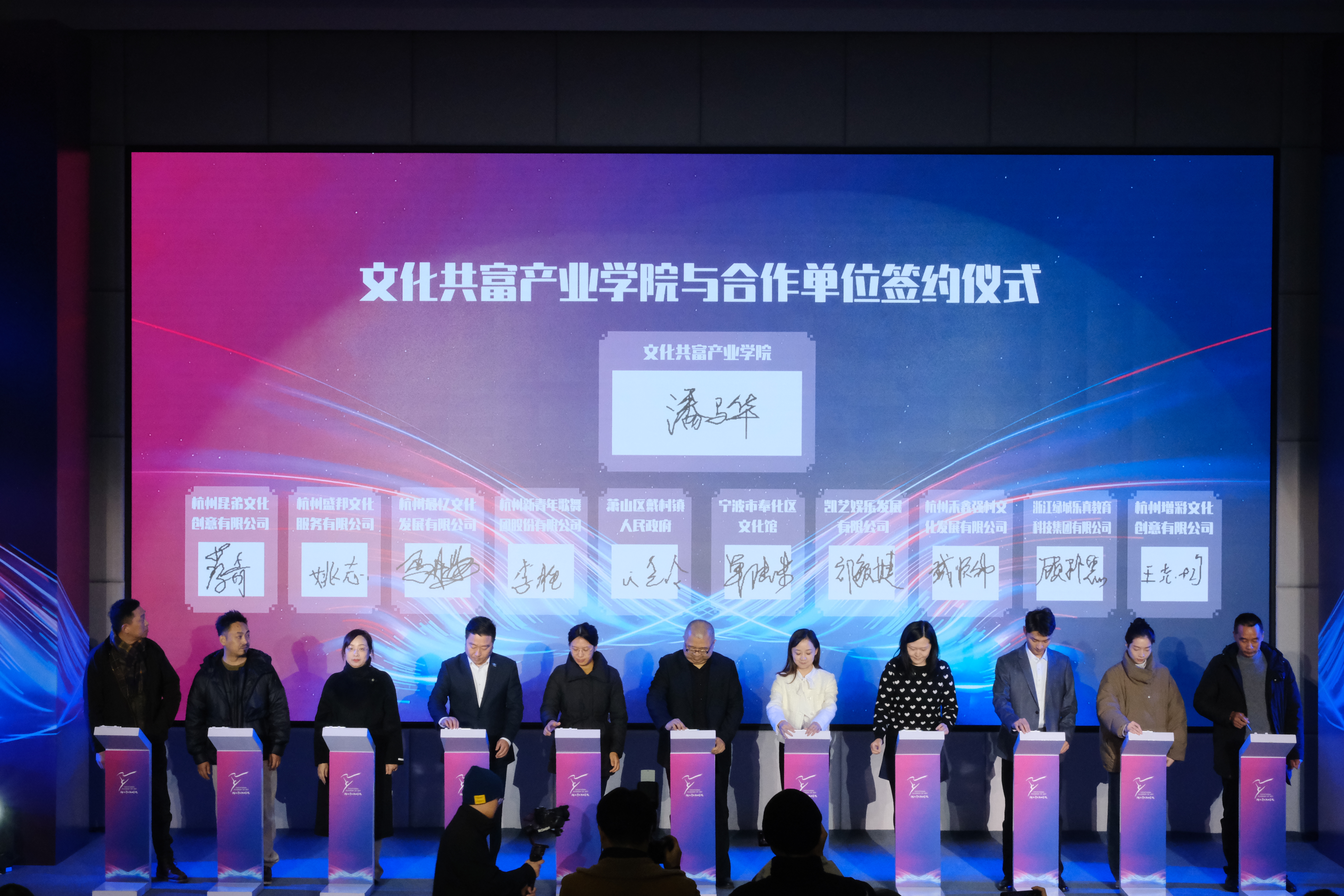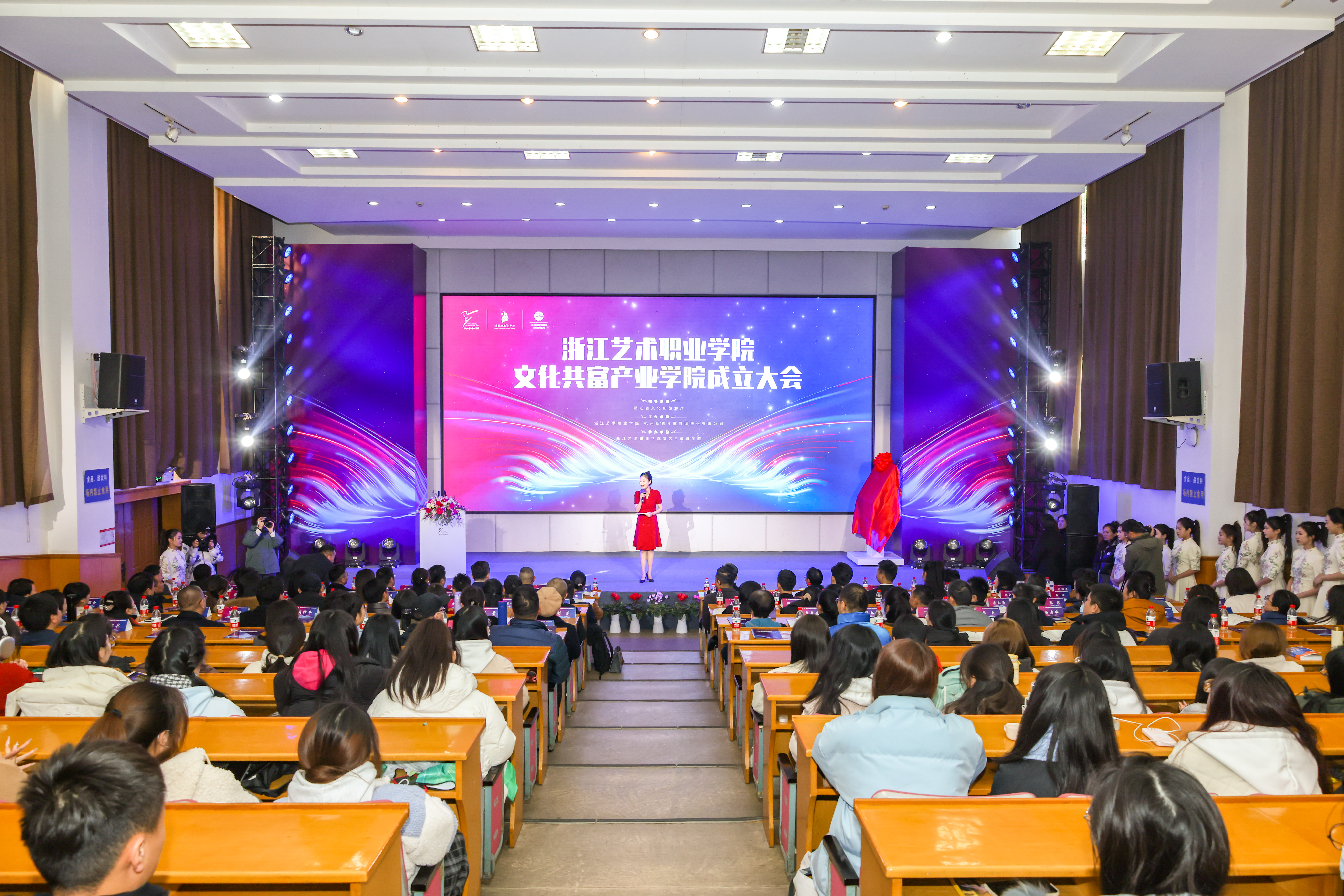 浙江省文化和旅游厅相关部门负责人,宁波市奉化区人民政府、宁波市奉化区文化和广电旅游体育局、宁波市奉化区文化和旅游集团、宁波市奉化区文化馆、杭州市萧山区戴村镇人民政府、杭州新青年歌舞团股份有限公司等单位领导、产业学院共建单位代表、浙江省舞台艺术“1111”人才代表和学校党委班子成员、中层干部、师生代表齐聚一堂,共同见证学校高质量发展迈上新台阶。