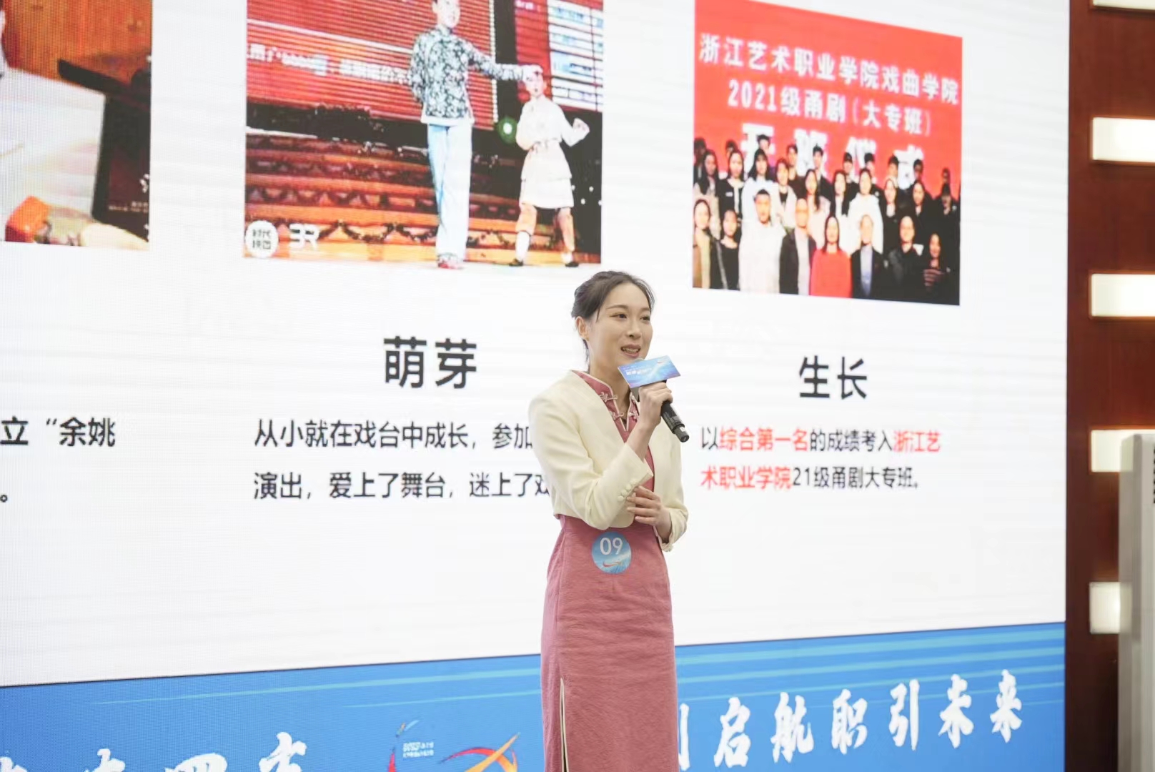 戏曲学院2021级戏曲表演专业甬剧班学生李梦凡,现场表现出色,表演国家非物质文化遗产甬剧唱段,围绕行业现状、职业探索、个人核心技能展示和未来规划等,展现了她作为甬剧第九代传承人传承和发展地方剧种的决心。最终以97.22的高分获得就业赛道职教组公共服务分赛道金奖第一名和最佳个人风采奖。