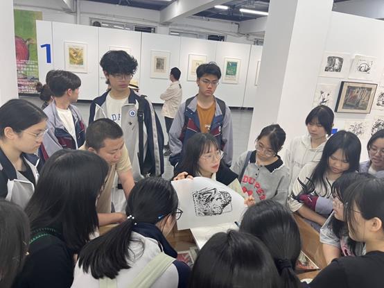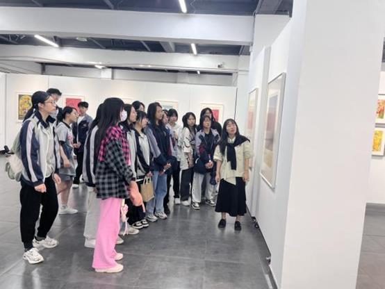 专业教师用参观展览与教学现场相结合的方式,向同学们讲解了绘画中常用的技巧,让同学们感受作品中变形与夸张的艺术手法、高超的线条能力及经过提炼的色彩表现,加深对绘画的理解,激发学习热情。