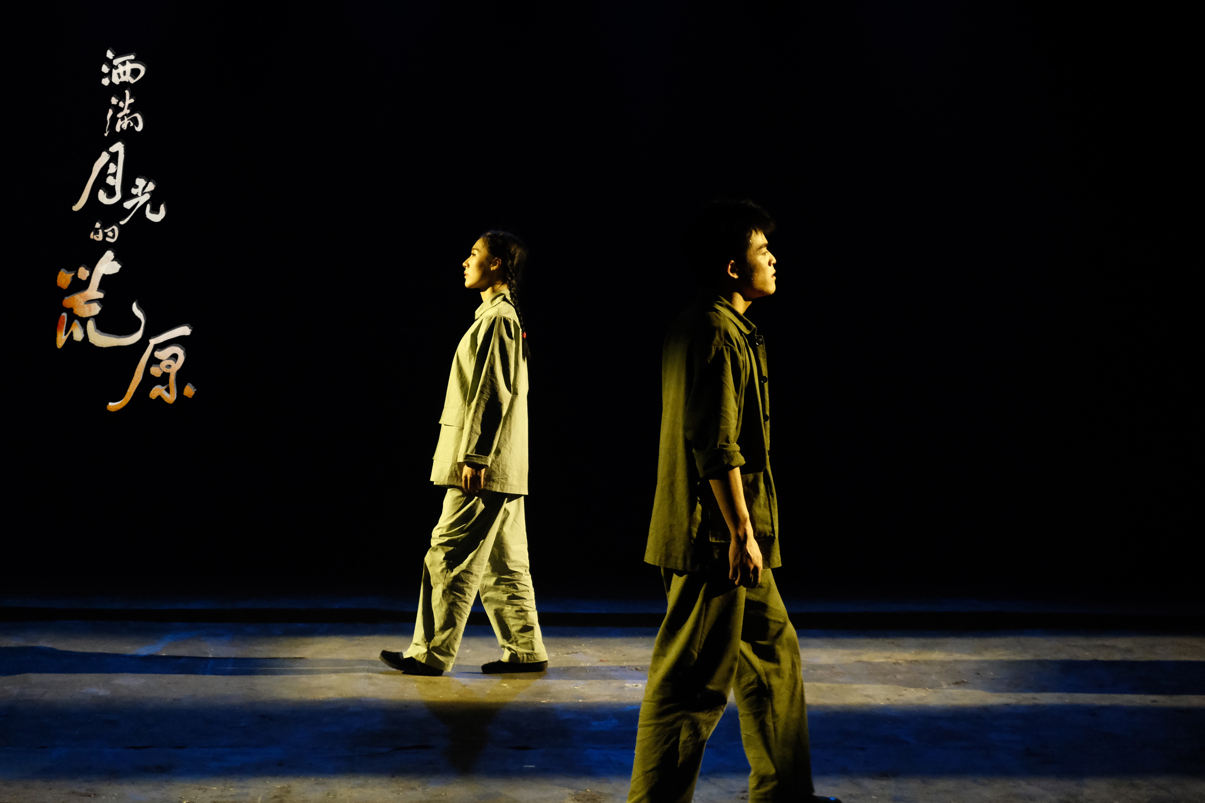 《洒满月光的荒原》采用诗意现实主义的形式,刻画了激扬的青春与无奈的命运。话剧一开始,由中年马兆新的内心独白展开,再与青年马兆新的“穿越式”对话贯穿全剧,使舞台表现突破了时间上的限制。全剧的舞台场景设置简洁又富有意蕴,干枯的树木、不规则的斜坡、孤独的树桩,巧妙地把舞台划分成几个特定区域。采用多种颜色的灯光设计,将冷暖色调融合在一起,宏伟之中又透露着些许悲凉。几个小光区的覆盖,不仅使表演区自然明了,也解决了时空转化的问题。整部戏的各个环节均体现出一种诗意的美,每个镜头单独分离出来都如一帧精致画面,节奏上起伏缓慢又错落有致,把握得恰到好处。