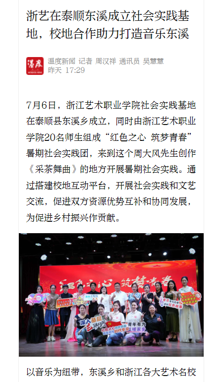 温度新闻:浙艺在泰顺东溪成立社会实践基地,校地合作助力打造音乐东溪