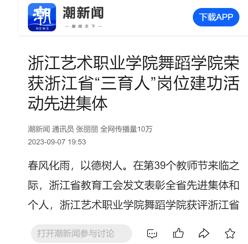 据悉,浙江省“三育人”岗位建功活动自今年4月开展以来,舞蹈学院多维度调动全院教职工教书育人、管理育人、服务育人的积极性和创造性,紧紧围绕省第十五次党代会、省委十五届二次全会和“三个一号工程”的决策部署,取得了成绩。