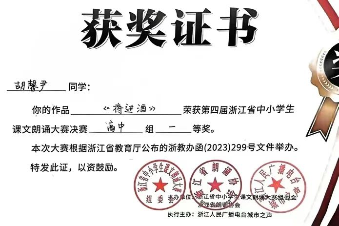 2023~2024学年,我校戏剧表演专业师生在浙江省中小学生艺术节、浙江省中小学课文朗诵大赛及“曹灿杯”青少年朗诵展示活动中荣获多项殊荣。