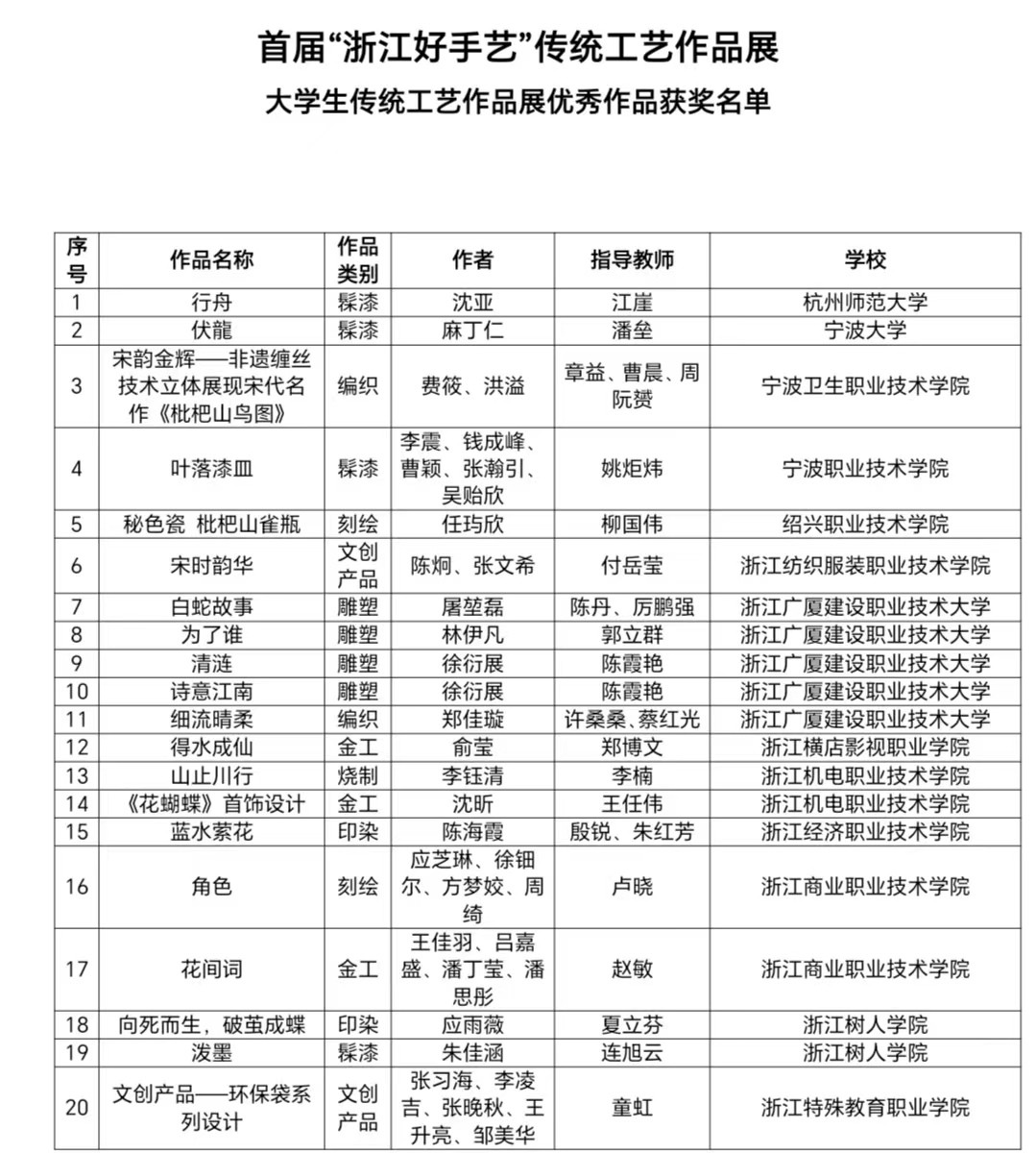 首届“浙江好手艺”大学生传统工艺作品展终评获奖名单公布