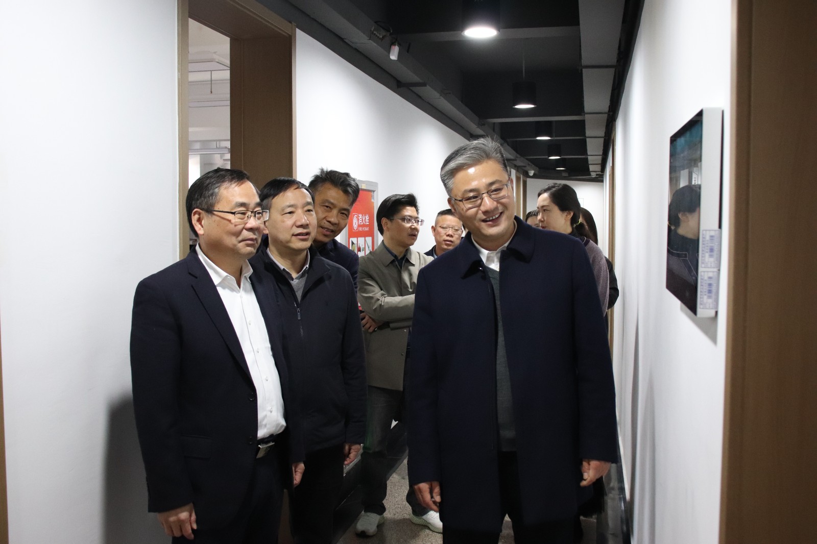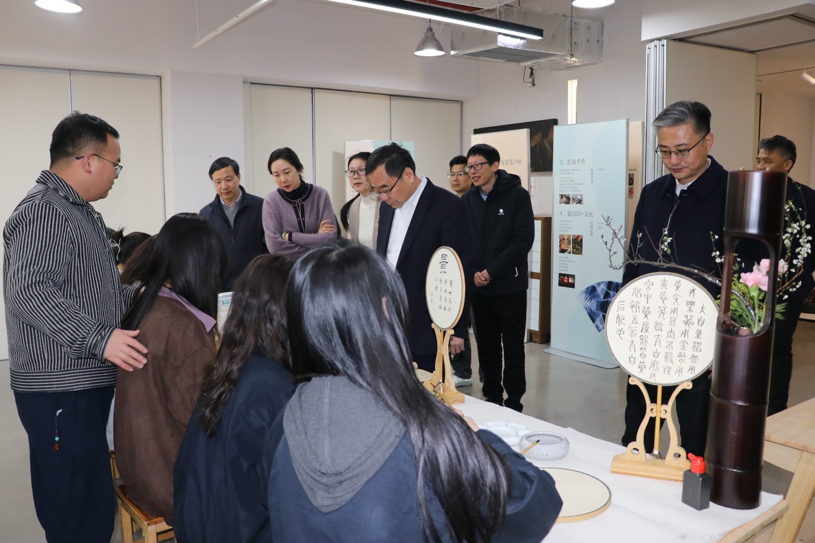 张广洲一行参观了学校东冠校区、手工艺学院、音乐学院、舞蹈学院、设计学院、附中等教学实践场所,走进课堂,同师生交流,了解新教学综合楼建设进展,并与我校党委班子成员进行座谈交流。