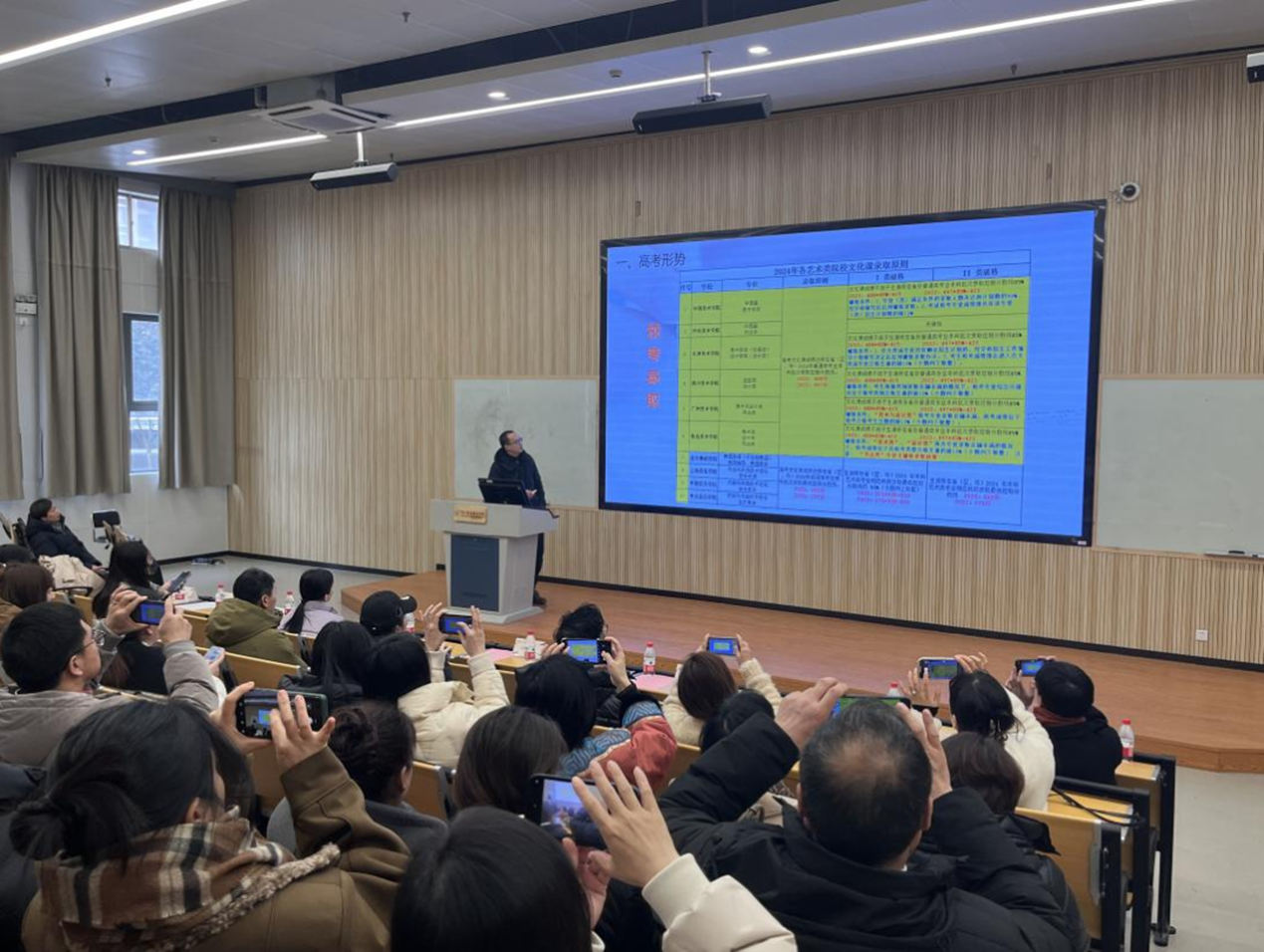 沈飞介绍了本学期的文化课教学安排,并以近几年数据为参考,对各艺术类院校的文化课要求和录取规则做了分析和讲解。