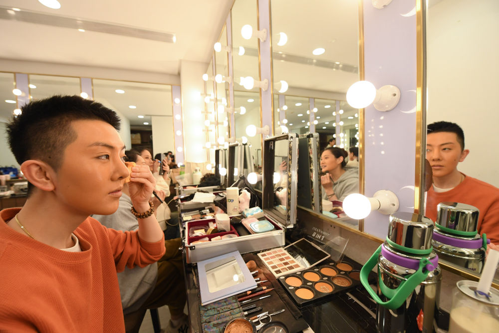 2024年5月1日,参演新编现代戏《钱塘里》的演员在杭州蝴蝶剧场的化妆间上妆。新华社记者 翁忻旸 摄