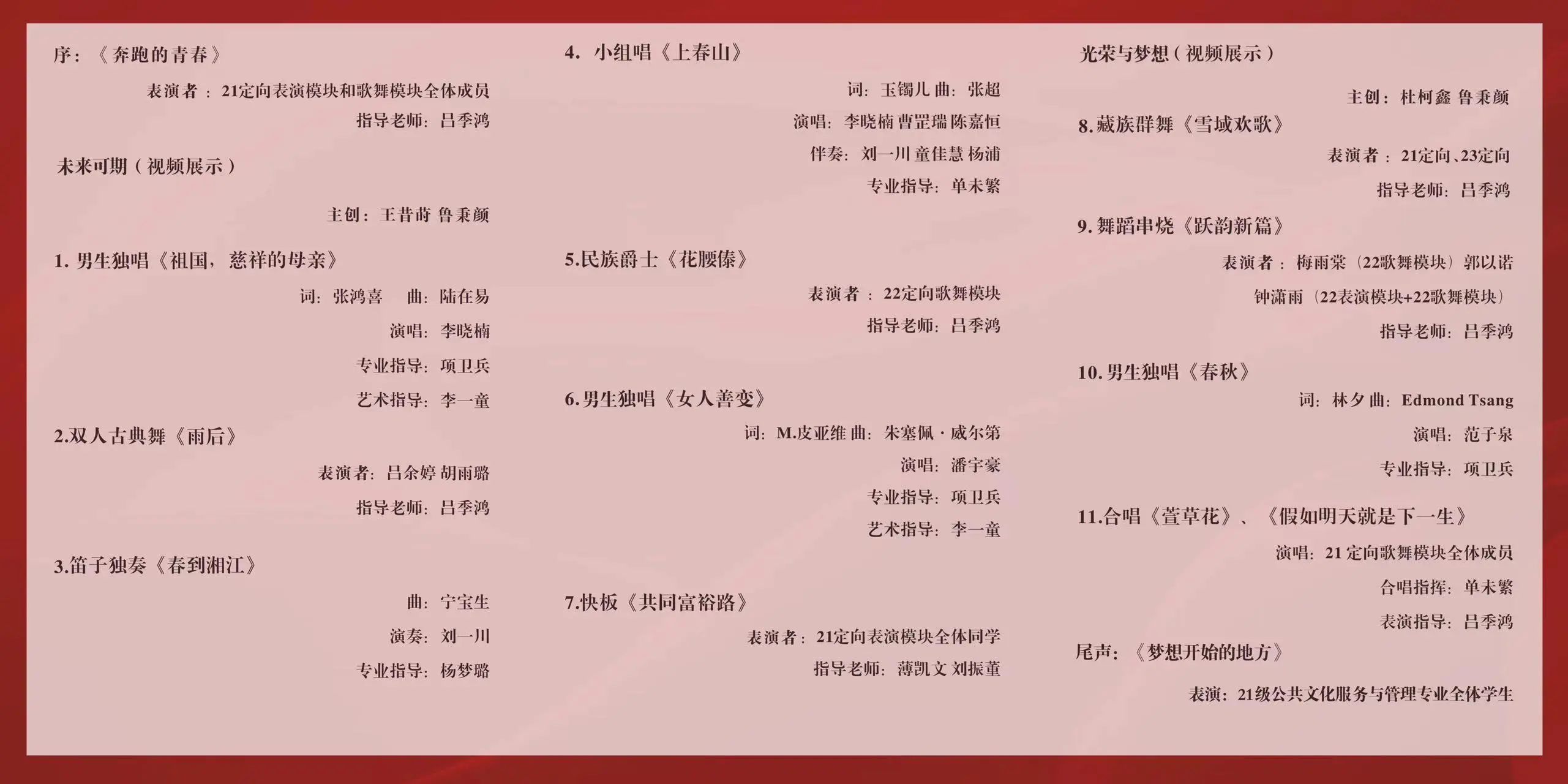 大学三年时光,21级的青春梦想在“浙”艺启航,也将在“浙”里的各地扬帆。毕业演出已经落下帷幕,但这并不意味着他们的故事就此结束。愿他们满怀硕果,告别那些充满欢歌笑语的日日夜夜,满载着对基层文化事业的热爱以及成为一名优秀乡镇文化员的决心,奔赴各自的岗位,不忘初心,砥砺前行,去绘就新时代共富路上的新篇章!