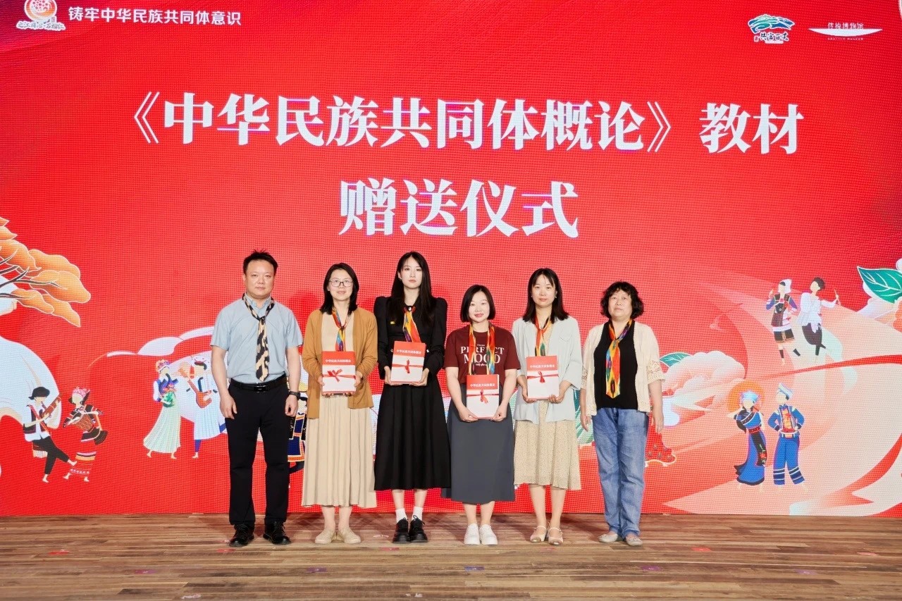 杭州市政协农业和农村委副主任李生荣与传梭博物馆馆长郑芬兰共同为“智汇乡村·行走的传梭博物馆”揭牌,并向我院授牌,标志着传梭博物馆在推动乡村振兴与文化遗产传承方面迈出了坚实的一步。杭州市民宗局党组成员、副局长,机关党委书记顾建强和杭州市民宗局机关党委专职副书记郭丽敏向我赠送《中华民族共同体概论》教材,希望各民族青年讲好中华民族共同体故事,为铸牢中华民族共同体意识贡献青春力量。