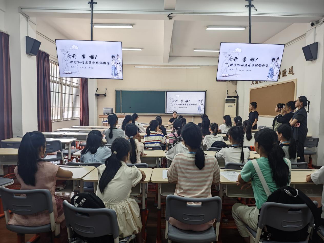 在福建芳华班、宁海平调班的新生班会上,教研室主任、班主任、辅导员老师们以轻松愉快的氛围,引导新生们相互认识,分享个人爱好与梦想。老师们还强调了学习方法与态度的重要性,鼓励孩子们拓宽视野,在追求艺术路上守正创新、勇于实践。宁海平调班全班同学还在校团安排下依次上台进行专业展示,进行了行当划分,在校团的共同见证下为自己的戏曲舞台播下了第一粒种子。