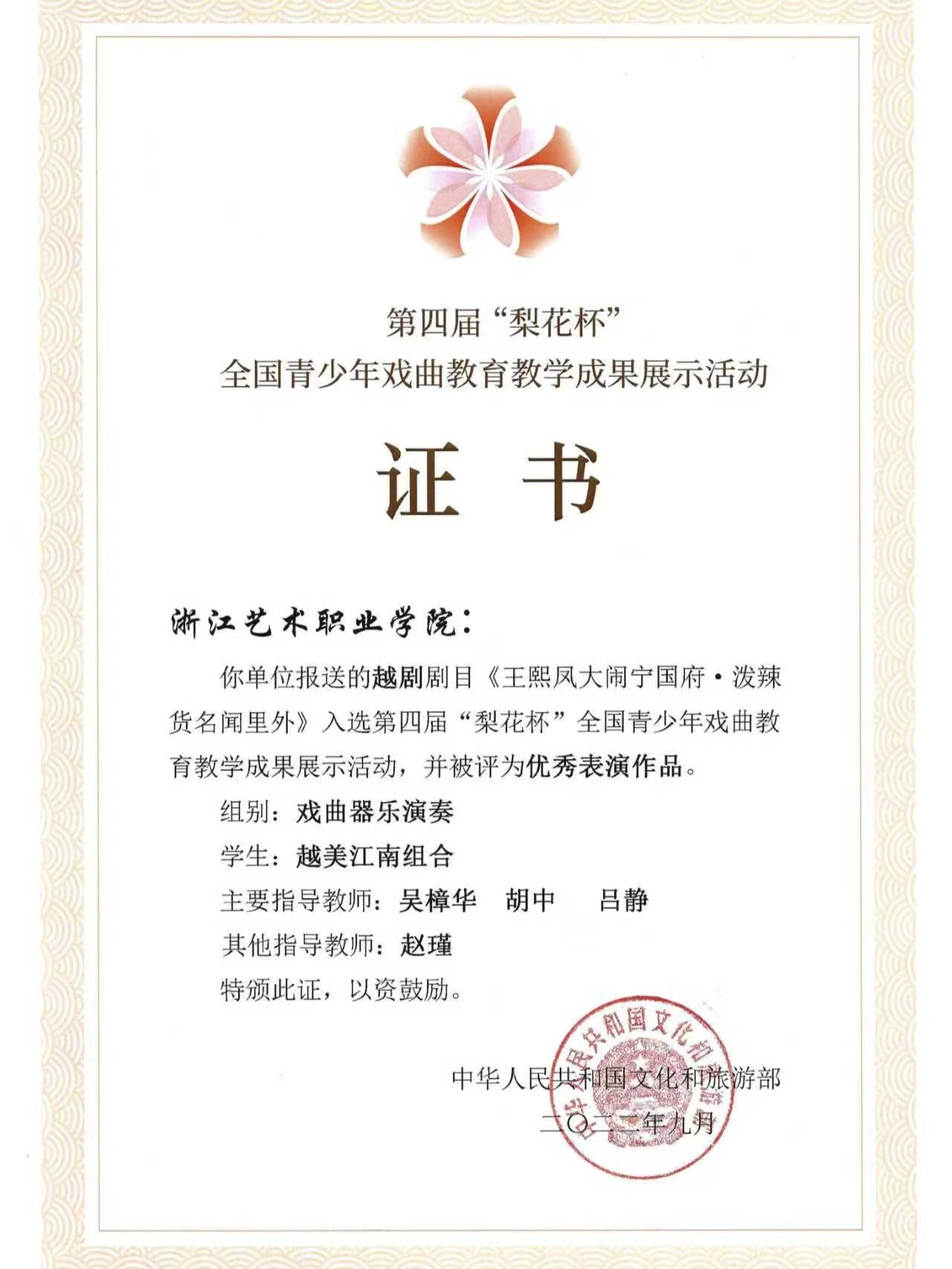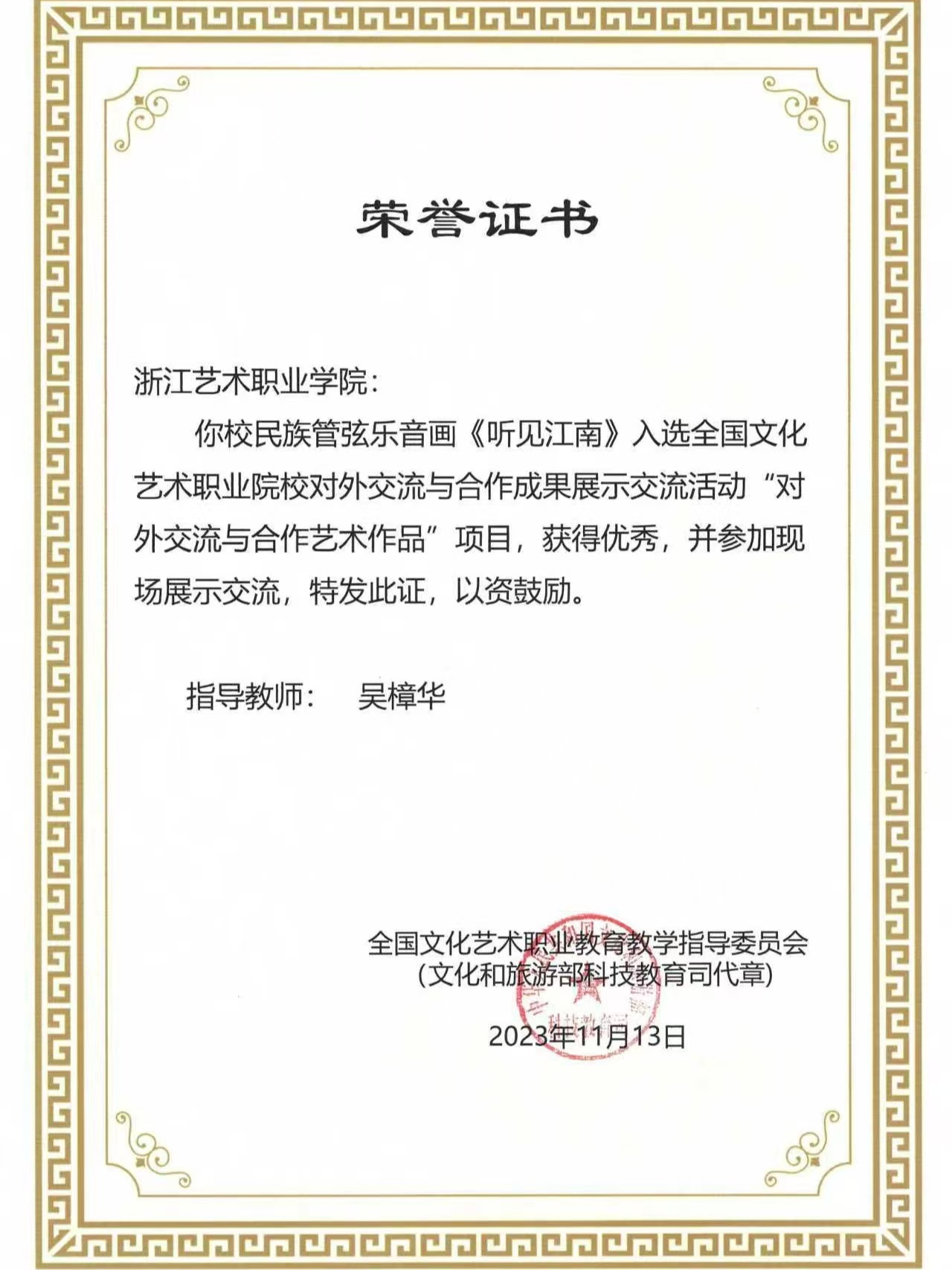 近年来,学院师生在国家级、省级各类专业赛事中累计获奖300余项,其中文化和旅游部中国民族器乐民间乐种组合展演奖3项、“红铜鼓”中国—东盟艺术教育成果展演奖3项,全国职业院校技能大赛艺术专业技能赛项一等奖8项,世界职业院校技能大赛总决赛一等奖1项、二等奖4项,全国大学生艺术展演活动二等奖2项,浙江省大学生职规赛、“挑战杯”、国际大学生创新大赛等赛事金奖1项、银奖2项、铜奖1项。立项国家艺术基金项目3项、省艺术基金大型项目4项、省人工智能教育应用试点校项目1项、浙江文化艺术发展基金资助项目8项,获奖等级和数量在全国艺术高等职业院校中位居前列。