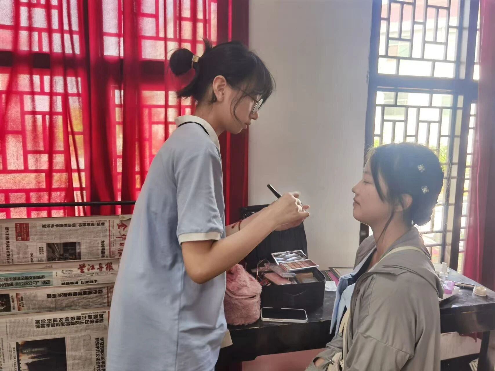 进入浙艺,方馨靓在专业老师的指导下迎来了更系统的塑造。大一为小学文艺汇演化妆的经历,成为她职业认知的深化点。她深刻领悟到舞台妆的核心:强调五官对比、效果夸张明快、追求速度与效率。这份经历也磨砺了她不可或缺的耐心与娴熟技艺。