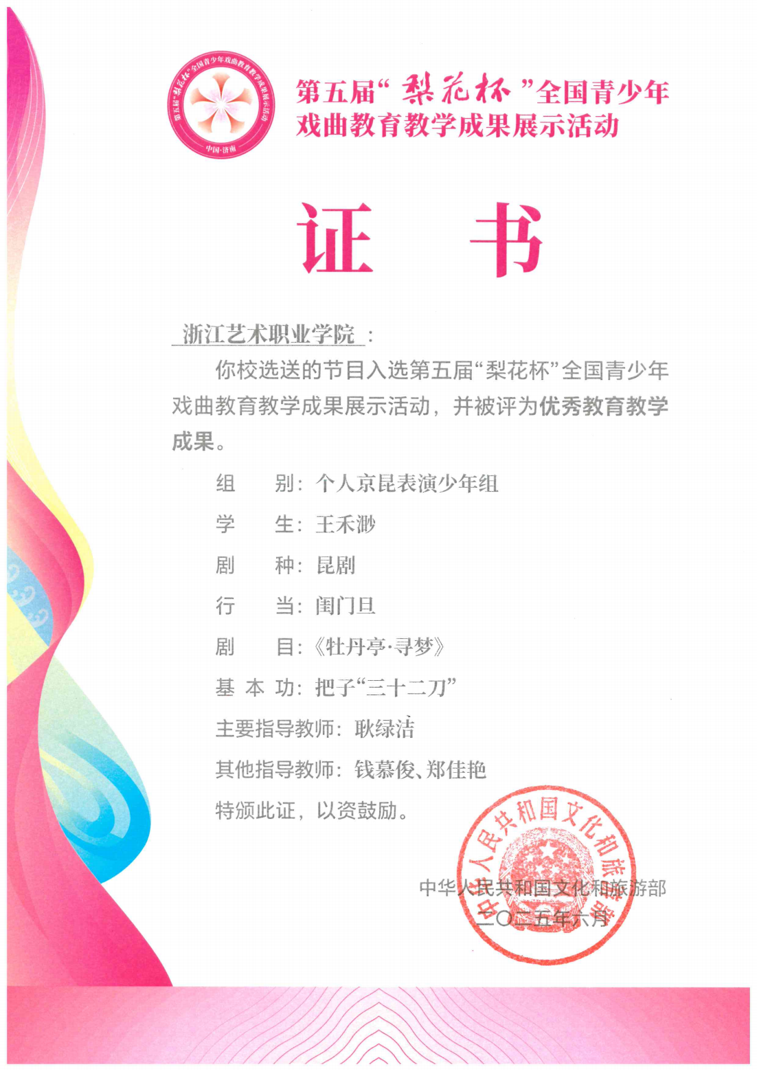 第五届“梨花杯”全国青少年戏曲教育教学成果展示活动获奖证书