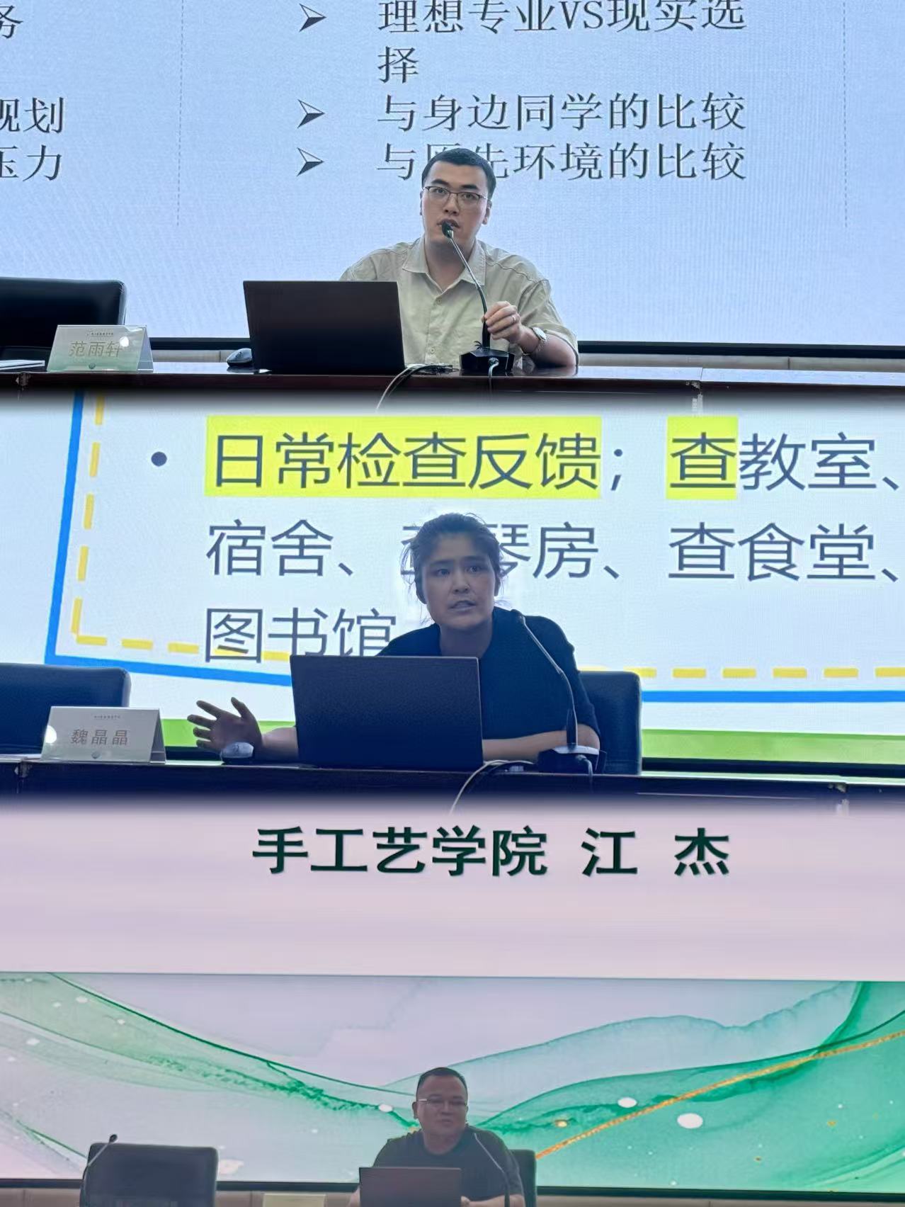心理健康中心范雨轩老师针对新生常见心理困扰及其应对方式进行了详细解读。音乐学院魏晶晶、手工艺学院江杰作为中职、高职段的班主任代表,结合自身带班经验进行分享交流,内容涵盖班级建设、学生关怀、家校沟通等方面,为新生班主任提供了宝贵借鉴。